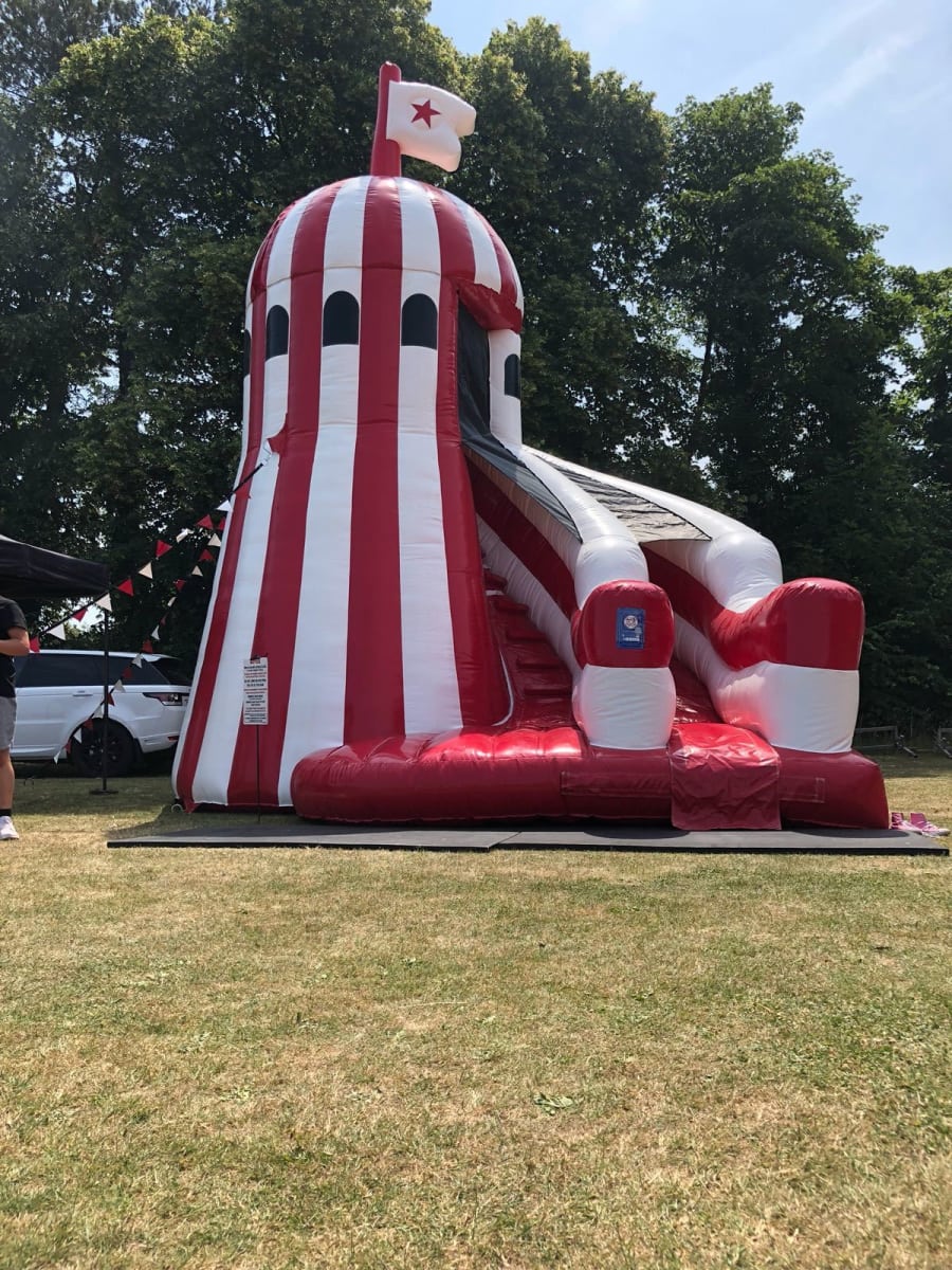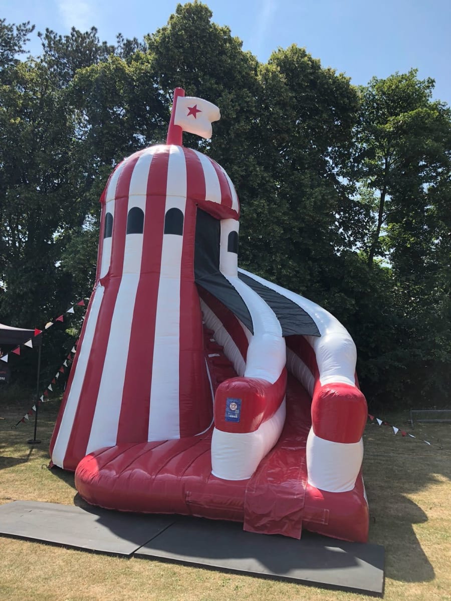 Our inflatable helter skelter slide has exclusive custom made decorative bunting for extra effect.