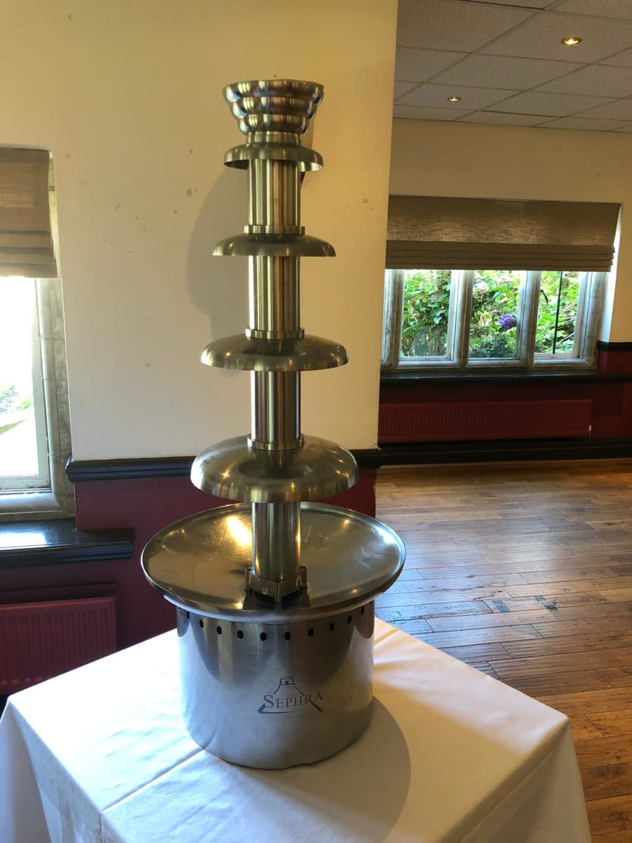 Our commercial grade 5 tier chocolate fountain stands at 4ft tall supplying warm luxury Belgium chocolate for you to dip 8 yummy treats into.